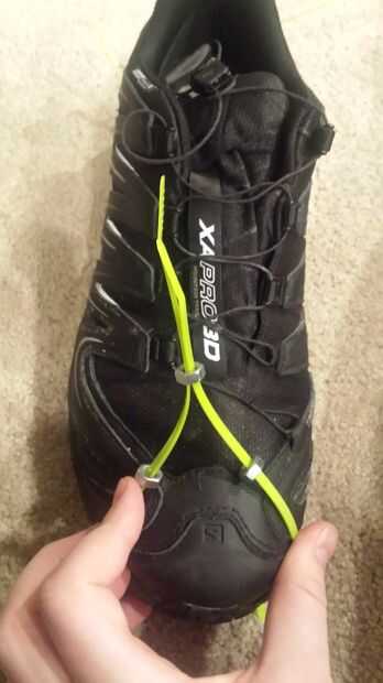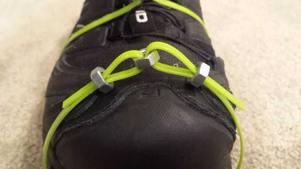2. doblar los lazos zip encima y deslizarse debajo de cada tuerca respectiva. Tire con fuerza para apretar los crampones.