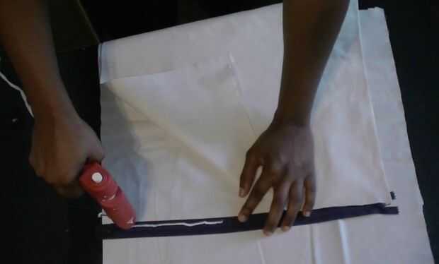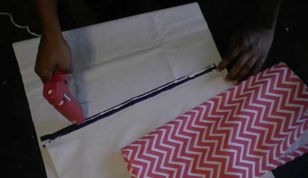 Empezar a montar la funda de almohada comenzando con la cremallera. Usando el pegamento para tela Fije la muselina a la parte superior de la cremallera. Asegúrese de no conseguir cualquier pegamento en la cremallera. Quitar el pegamento de la cremallera, una vez que se seca es casi imposible. Luego coloque la lona al otro lado de la cremallera.