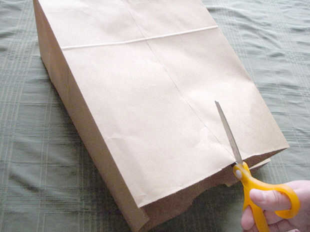 Para empezar, cortar la parte inferior de la bolsa y hacer un corte a lo largo para que tengas un rectángulo grande.