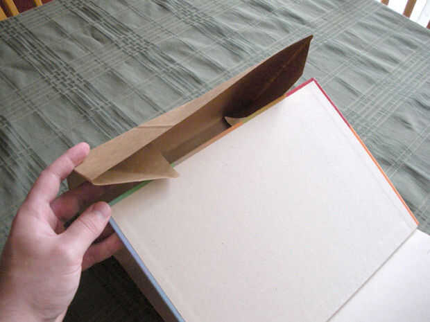 Deslice la cubierta de papel para que la cubierta de libro está dentro de los pliegues. Va a ser un ajuste apretado, así que lo mueva en si necesita.
