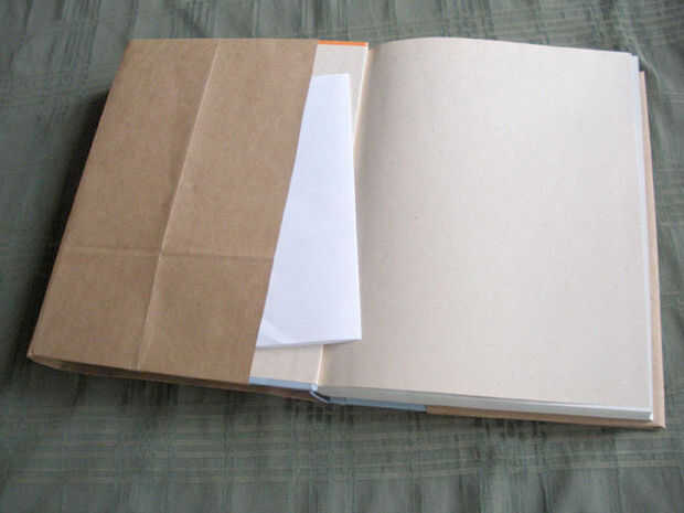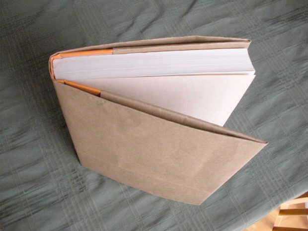 Esta cubierta de libro es resistente!Materiales necesarios para este proyecto:Bolsa de papel o periódicoCinta para ductosLibro para cubrirseRotulador o bolígrafo (no fotografiado).Paso 1: Dimensionamiento de la cubierta del libro Comience abriendo el