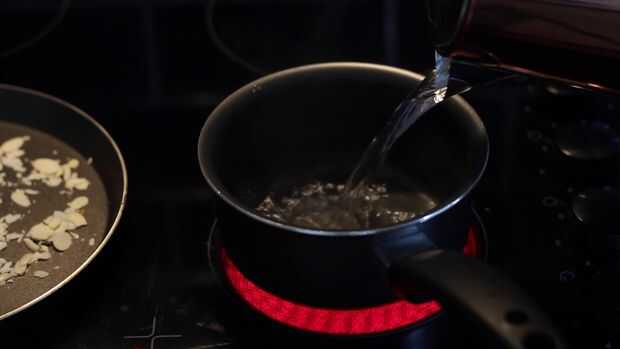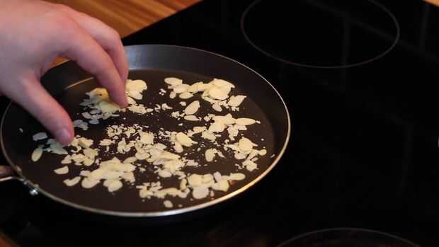 Tostar las almendras, no tienes que hacer esto o incluso añadirlos a todos. Tostar las almendras aunque es mucho mejor que no, el proceso trae todo el sabor y hace los 10 veces mejor. No añadir aceite a la sartén, solo mantener seca y el calor bajo a medio.