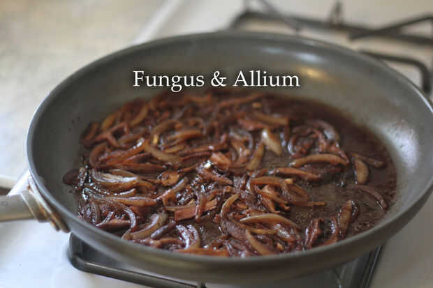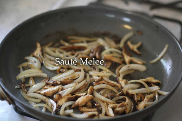 Añadir tus setas y cebollas a la sartén medio caliente y golpear con algo de sal. Rehogar hasta que están blandas las cebollas y setas.