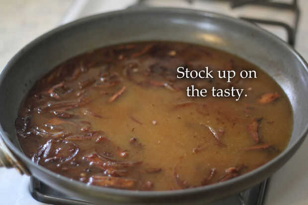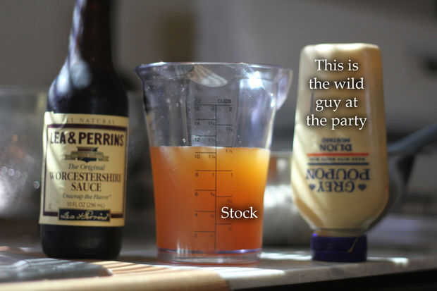 Añadir una cucharada de salsa worchestershire y 1 o 2 cucharaditas de mostaza de dijon y mezclar. Se puede mezclar con el caldo antes de añadir a la sartén si quieres.