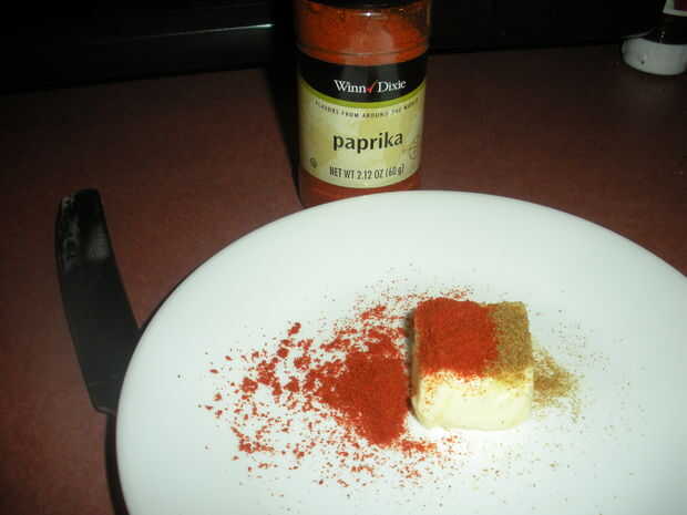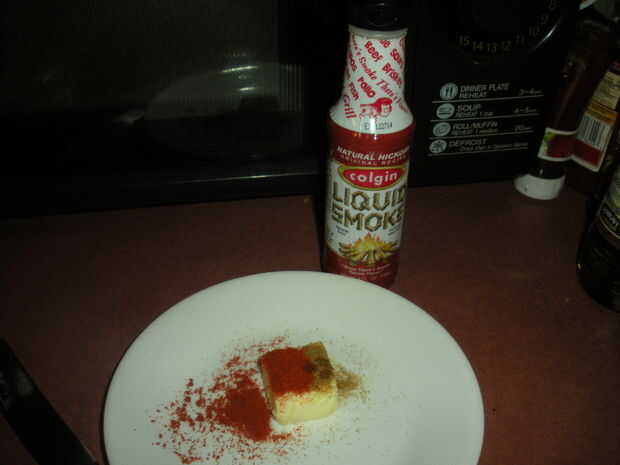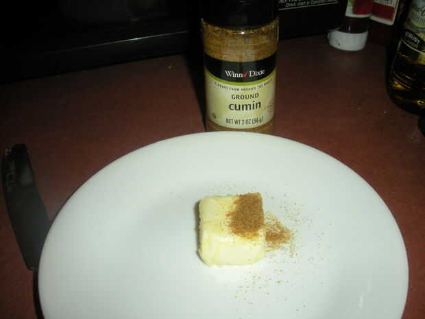 las fotos cuentan la historia pero, cortar un trozo de espolvorear de mantequilla (aproximadamente una cucharadita) en el comino, pimentón y humo líquido luego mezclan todo junto hasta un color uniforme
