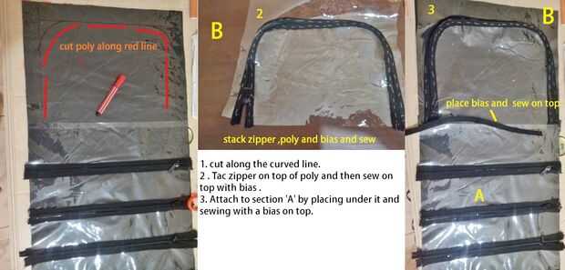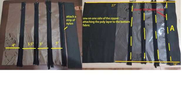 4. Coloque la sección A la tela de nylon y coser a lo largo de las líneas amarillas... Asegúrese de que usted sólo cose a un lado de la cremallera.