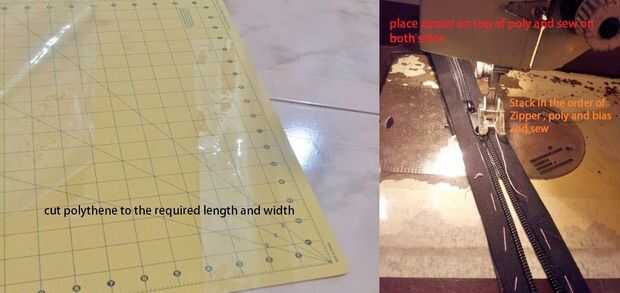 2. Conecte a cremallera colocando la tira de polietileno encima de la cremallera y luego diagonal cosido en la parte superior.