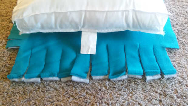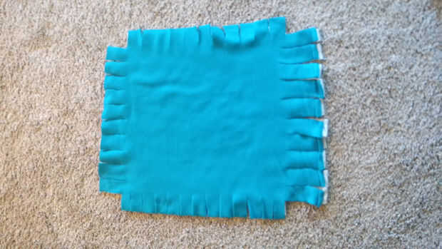 Continúe alrededor del lado de la tela por franja de corte de 3-5" de largo y 1/2" ancho. (Empecé por cortar flecos más grande pero no parece tan bueno como tener pequeños flecos)