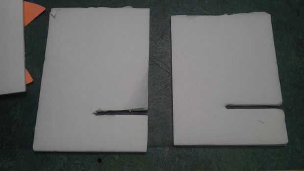 cada pieza, medida de 1/4 de la forma por la parte larga de la espuma, luego corte una cuña ¼" a 1/2 a través de la espuma.