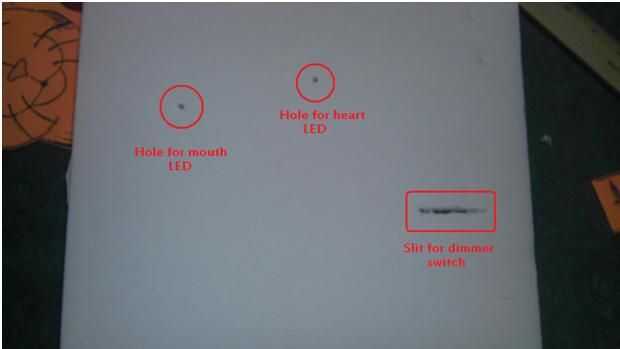 Determine dónde desea el gato a sentarse en el tablero, luego pegamento a la espuma excepto no adhiera los cuartos traseros del animal. Usted querrá dejar accesible para que la cola se puede conectar más tarde. Utilizando la imagen de abajo (imagen es frente a frente), perfore un agujero en la boca y otra en el centro del corazón. Más tarde, el LED brillará a través de ellos. Sobre dónde se colocará la cola, cortar una 2" horizontal de la raja en la Junta para el atenuador, interruptor y fácilmente se deslizan hacia adelante y hacia atrás a través de la espuma.