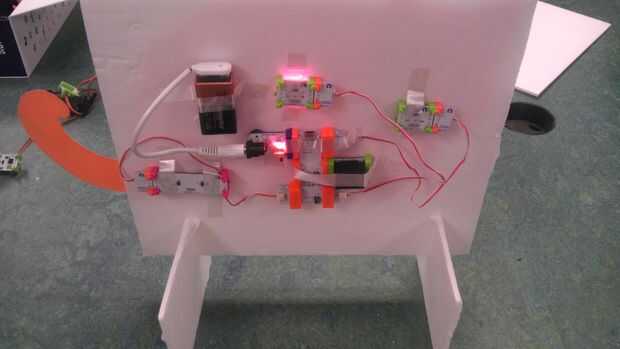 Abra el kit de LittleBits. El LED rojo debería activarse en el corazón. Cola de tirar kitty y el zumbador deben sonar y el LED verde debe encenderse en la boca. Esta es kitty, gritándole que no tire de su cola.