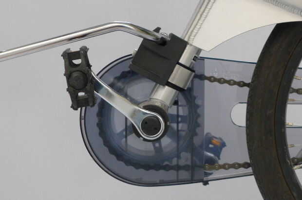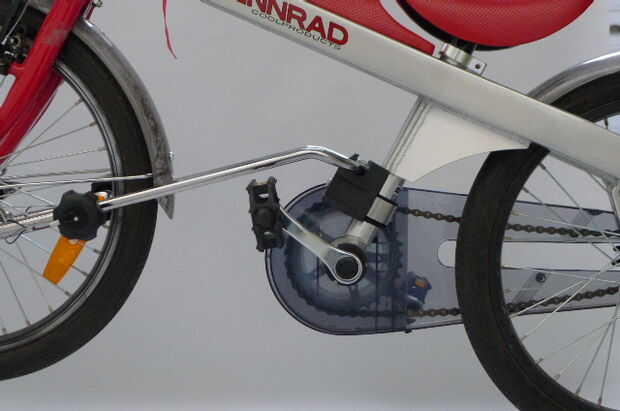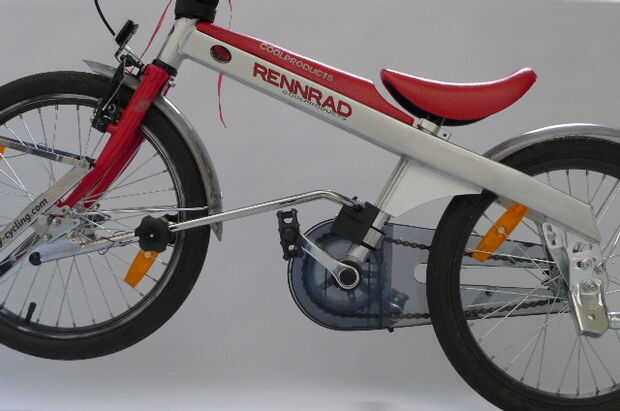 La razón por qué se podría cuestionar si la 18 Rennrad puede utilizarse en conjunción con un tándem de FollowMe es que el diseño de marco difiere fuertemente bicicletas infantiles estándar, como puede verse en la imagen. Pero como puede verse, así es posible conectar la pinza de FollowMe-Tandem (en negro) en el tubo entre el sillín y la manivela. Se trata de un poco de presentación para ensanchar la abrazadera ya mejor que se encuentra alrededor de los dos pernos de la biela de conexión. El brazo telescópico de FollowMe-Tandem es suficiente para llegar a la pinza en esta posición: los restantes cinco centímetros (dos pulgadas) son suficientes para hacer la tuerca moleteada haga su trabajo.