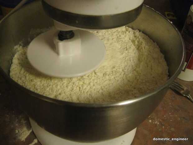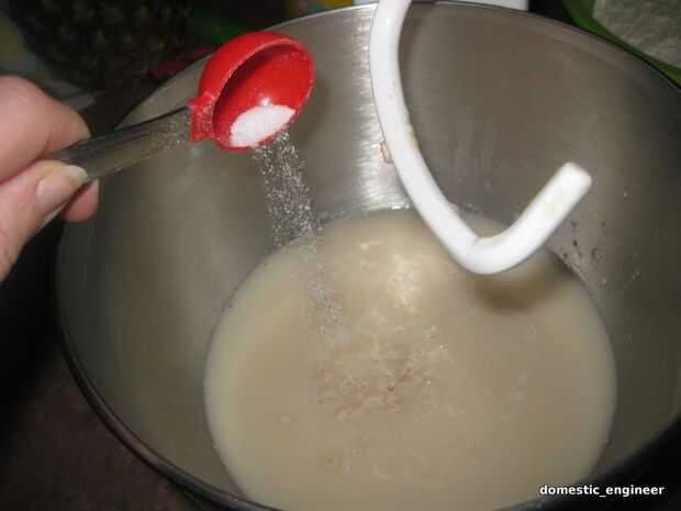 Poner la sal y revuelva. Luego añadir la harina. Mezclar con el gancho para masa, sobre la velocidad media. Bloquear el cuello de la batidora, o se saltan. Solo deja hacer su cosa. De la harina se consigue incorporados, y el tazón de fuente será limpia. Si no es así, añadir un chorrito más de agua. Si parece a suave, no forma una bola, añadir un poco más de harina.
