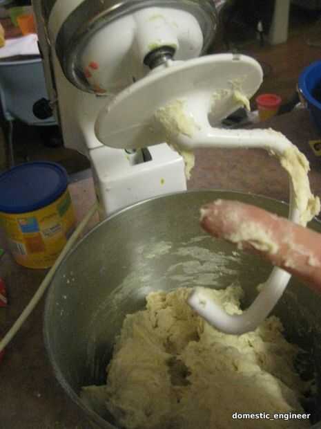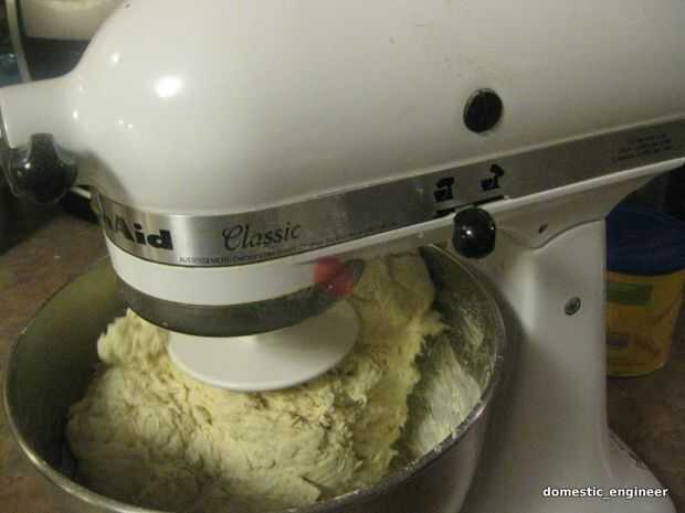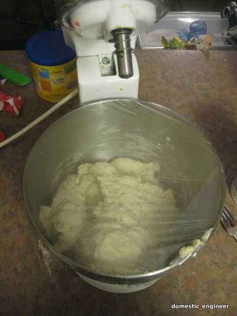 Levante el gancho para masa, raspe la masa. Sacar el bol, cubierta con el abrigo de saran y que suba durante unos 30 minutos. Debe duplicar en tamaño.
