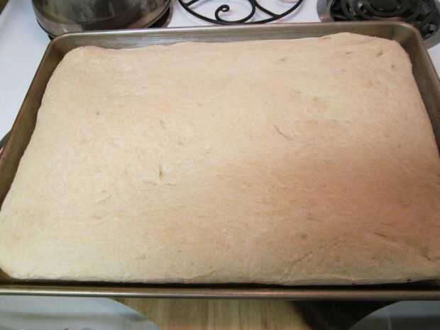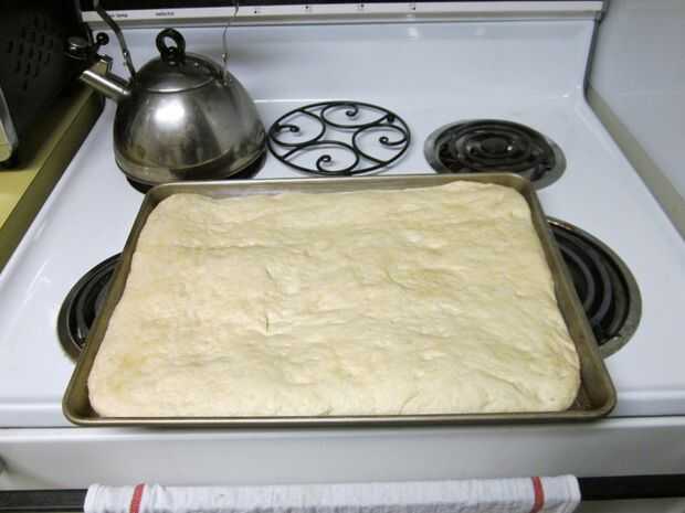 Después de que ha reposado la masa pegajosa suave durante 30 minutos, ligeramente una 17 "x 12" medio-bandeja con borde de aceite y poner la bola de masa en el centro. Dejar descansar durante 20 minutos.