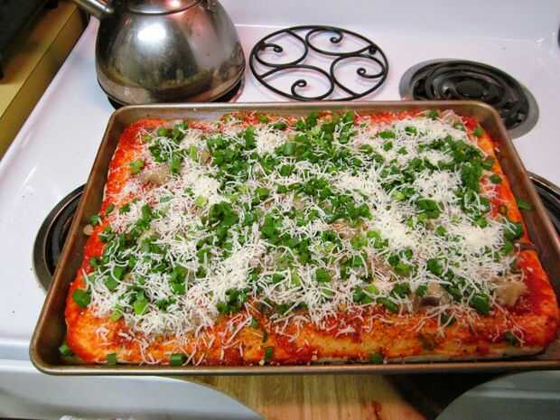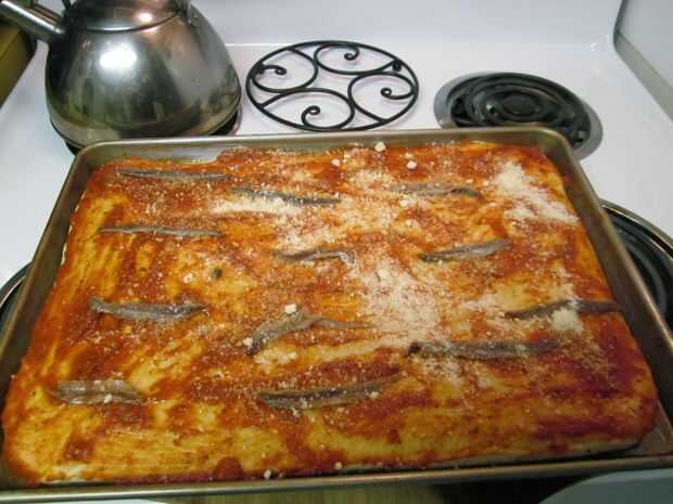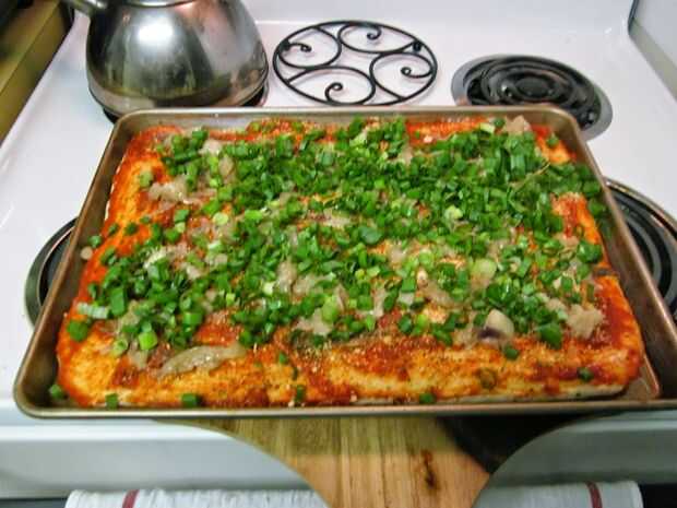 AHORA pintar la pizza mitad cocida con salsa de pizza. No más de hacerlo. Espolvorear con queso rallado y el condimento de pizza. Agregar anchoas. Si no te gusta anchoas uso aceite curado de aceitunas negras. Añadir las cebollas cocidas. Añadir que el crudo rebanado cebollas verdes. Añadir el queso rallado de pizza, mozzarella o provolone o lo que te gusta mezclar.