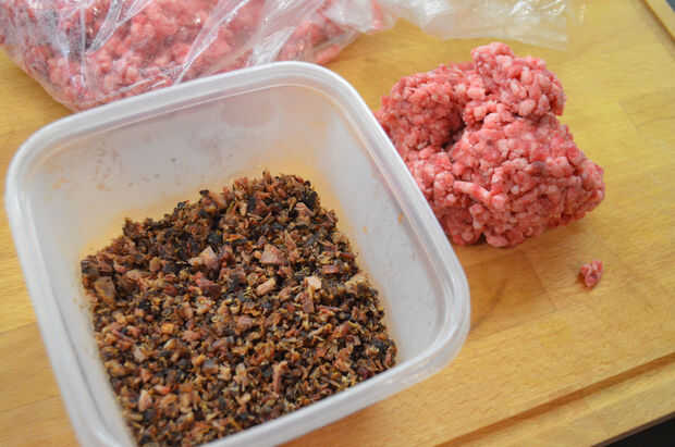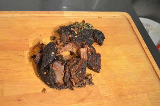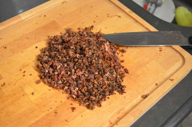 Esto no puede ser más fácil. Tomar sus recortes de pecho ya ahumado (extremos quemados) y picarlos hasta muy fino, usted puede hacer esto a mano como lo hice o tirarlas en un procesador de alimentos, no importa. Haz que la consistencia de trozos de tocino. Dependiendo de la "carne" al cociente de la "Barca" (la corteza externa con el sazonador de especias) puede agregar más condimento si quieres, he añadido algunos fresco pimienta agrietada pero el salado y el ahumado ya era bueno.