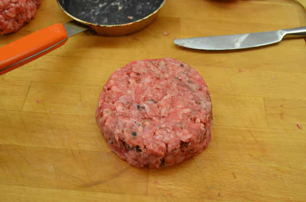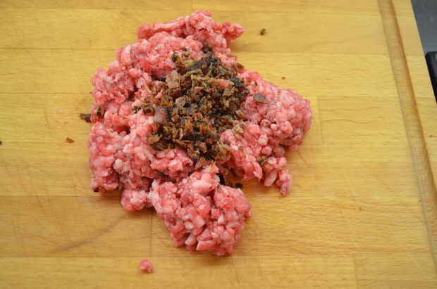 Había recogido, desde el carnicero local, 2 libras de pecho de tierra recién con sobre un 30% de materia grasa al cociente de la carne. Yo pesaba hacia fuera bolas de 6oz y luego alrededor de 1/2 a 3/4 oz de los pedacitos de carne a cada hamburguesa. Esto entonces se amasa en la carne de hamburguesa cruda hasta que constantemente se distribuyó.