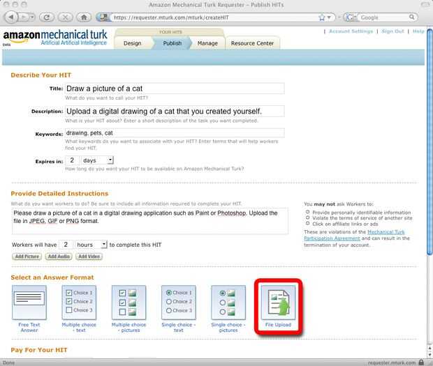 Presentar su tarea, luego ingrese a otro, pidiendo imágenes en vez de historias. Para la segunda tarea, el tipo de respuesta será "subir archivo" - pedir trabajadores para dibujar imágenes en su ordenador (o en exploración), después le enviamos los archivos.