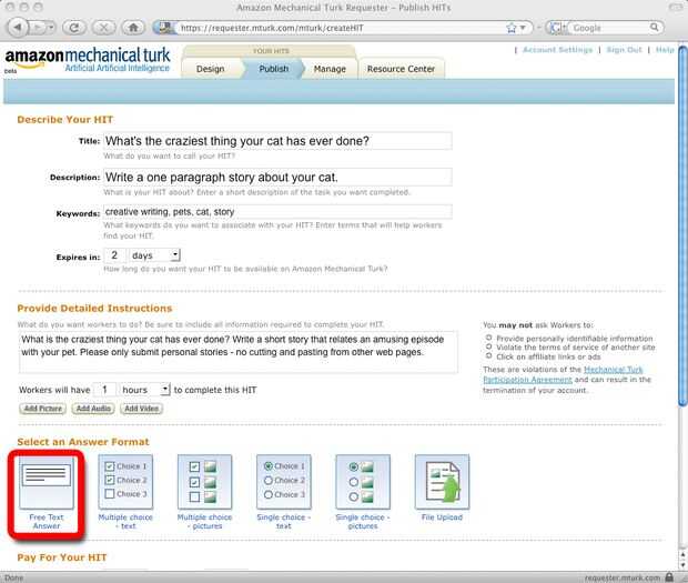 1 o 2 días deberían ser suficiente como una fecha de caducidad. Recopilar historias, elegir el formato de respuesta "texto plano". Cuántas respuestas quieres que seleccione. 50 a 100 es un buen comienzo. La ir es alrededor $.05 a $.10 para una historia o una imagen.