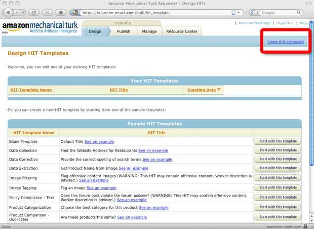 Así que vamos a crear nuestro primer golpe - la interfaz de MTurk realmente está dirigida a personas que quieren tomar grandes conjuntos de datos de las cosas y los empareja con grandes grupos de personas. Por ejemplo, al aventurero Steve Fossett desapareció, amigos de sus subidos miles de imágenes de satélite (el gran conjunto de datos) y consiguió un gran conjunto de los trabajadores mirar cada imagen individual para determinar si un avión se estrelló era visible en la imagen. Pero que tipo de funcionalidad no es realmente lo que queremos: queremos hacerle una pregunta simple, pero conseguir un montón de respuestas. Así que en la interfaz del solicitante Turco mecánico, te pase las opciones por defecto y seleccione el vínculo "Crear HITs individualmente".