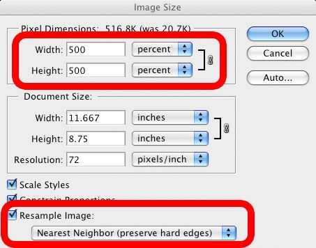 Para las tareas de la ilustración, la hoja de cálculo contiene una columna de URLs para descargar cada archivo. Como lo descubrió, mayoría de la gente sólo iniciar Microsoft paint y dibujar imágenes pixeladas de baja resolución. Pero aquellos tienen una agradable estética propia. Sin embargo, para imprimir las imágenes en un libro, tendrás que aumentar la resolución del archivo sin perder la estética boxy en el camino. No contar con la impresora para hacerlo para usted. La solución es que muestra la imagen utilizando a un "vecino más cercano" escala. Photoshop ofrece esta opción en su tamaño de imagen de diálogo (ver captura de pantalla) - otros editores de imagen probablemente tienen valores similares.