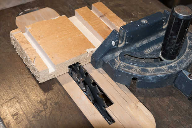 A continuación ajustar la hoja de ranurar en un ancho de 13/16" para acomodar el grosor del pino utilizado para la pared interior. Profundidad de la cuchilla se encuentra dejar una ranura aproximadamente 3/8" de profundidad (lo suficiente para dejar espacio para expansión de la pared debido a la humedad en la colmena). Siempre pruebo la anchura y la profundidad de mi configuración de madera antes de realizar cualquier corte final.