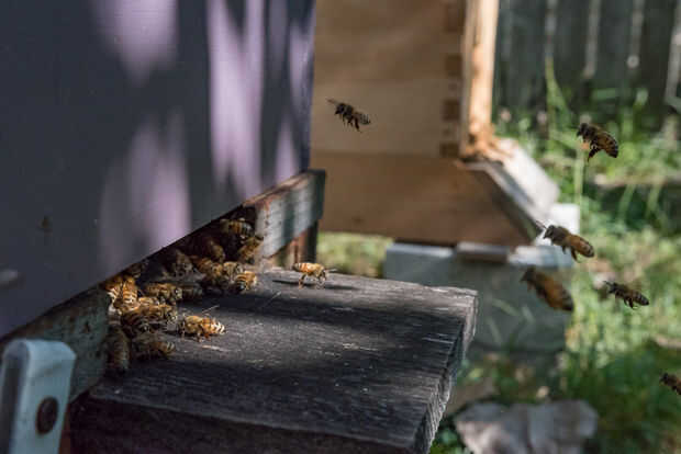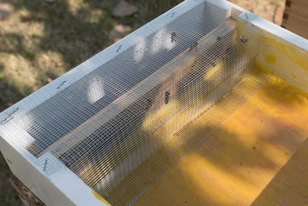 Añadir jarabe de azúcar para la alimentación, ya sea 1:1 (azúcar en agua, por peso) luz jarabe en primavera o en almíbar 2:1 en otoño. Inicialmente sólo añadir suficiente llenar el alimentador a aproximadamente 1/2" profunda para hacer que no las pérdidas de plomo a una cascada de jarabe en la colmena. Salpica unas gotas hacia abajo a través de la malla y en las barras superiores de la caja de abajo para alertar a las abejas que hay cosas buenas encima. En mi experiencia tarda sólo unos minutos de las abejas para rápidamente comenzar a subir para el alimentador.