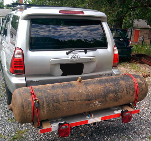 Hasta ahora mi compañía ha acarreados del tanque de aire en la foto, un totalizador IBC de 275 galones (sin jaula y palet), y equipo de camping y vacaciones. Si te fijas bien, he añadido dos trozos de ángulo de aluminio para la cubierta, estos junto con un perno en u que me permitan añadir un portabicicletas montado de enganche para transportar las bicicletas de los niños además el equipo extra.