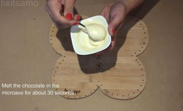 Derretir el chocolate en el microondas durante unos 30 segundos de blanco y déjalo enfriar (temperatura ambiente).