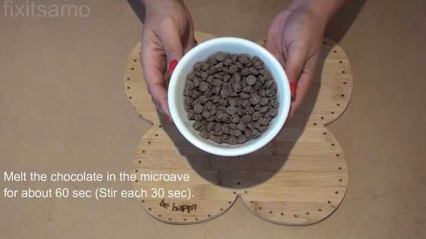 Fundir el chocolate en el microondas durante 60 segundos (revolver cada 30 segundos).