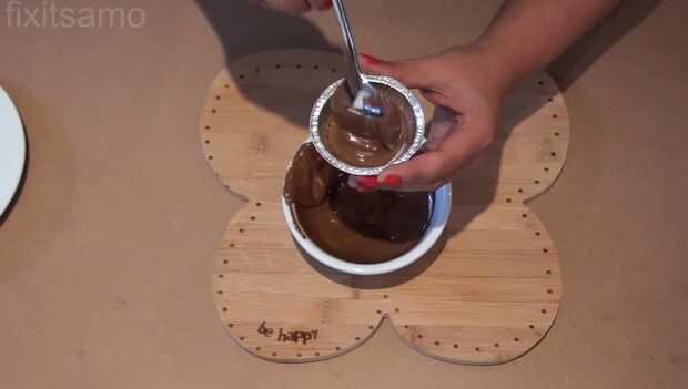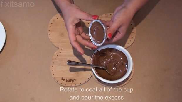Llene la taza con el chocolate derretido, gire para cubrir a todos los de la Copa y vierta el exceso.