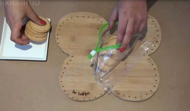 Poner las galletas en una bolsa de plástico y aplastarlas como se muestra en el video.