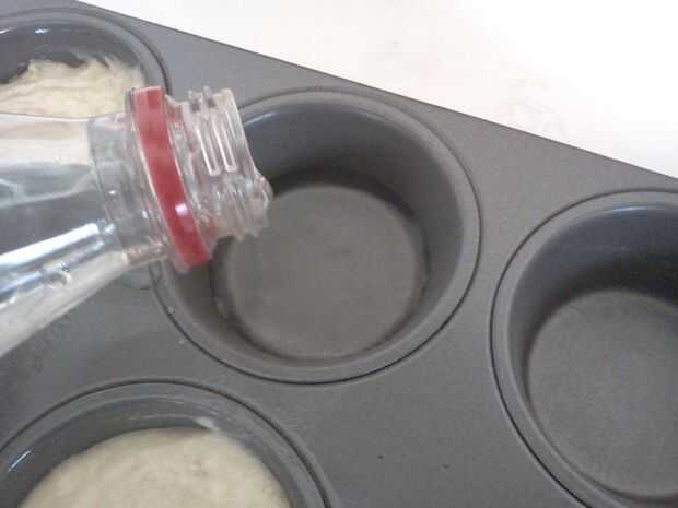 En los espacios vacíos de la cacerola de la Magdalena, añadir una cucharada de agua a cada uno. Esto ayudará a evitar que se queme y añadir humedad a los cupcakes de cocina
