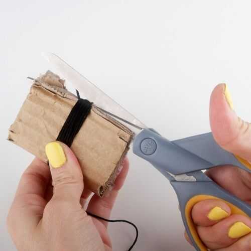Una vez que hayas terminado de envolver, voltee la pieza de cartón y corte el hilo entre donde uno de los extremos de la cartulina se encuentra con el otro.