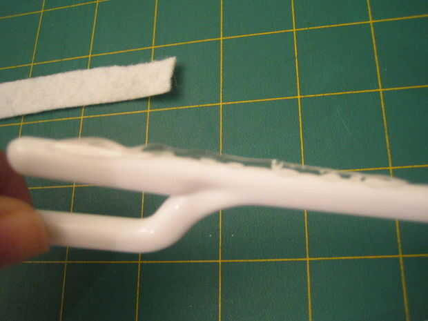 Coloque la tira de fieltro sobre el pegamento y empuje hacia abajo del plano. Pegamento siguen sienten que no está pegado abajo.
