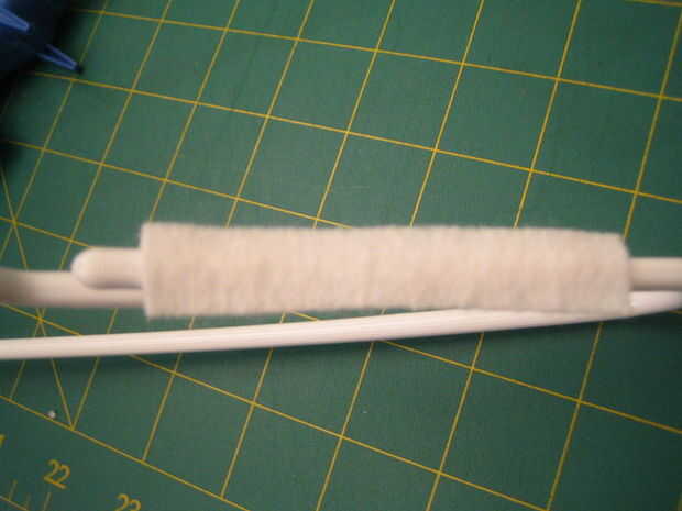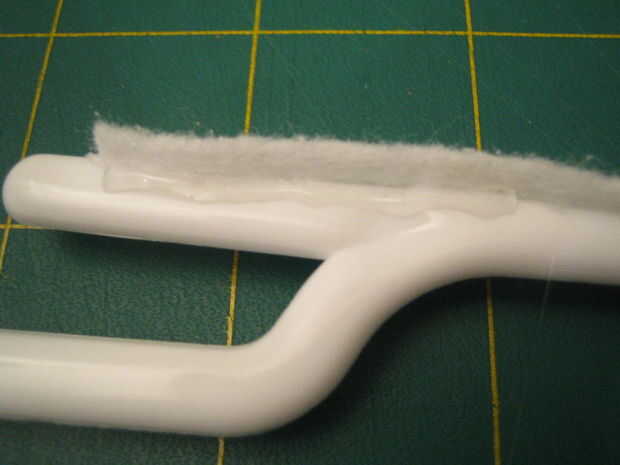 Poner la suspensión sobre la mesa. Ad una tira fina de pegamento lo más cerca posible de donde el fieltro con las suspensiones. Empuje el plano adjunto y difundir el pegamento hasta el borde de la pieza de fieltro. Repita en el otro lado de la de fieltro.