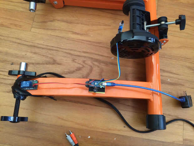 El detector que estoy usando es un detector de negro normalmente utilizado para la siguiente línea de robot. He puesto una tira de cinta blanco y negro en la rueda trasera de mi bicicleta, que se une al soporte de la bicicleta. Arduino está buscando dos detecciones de blanco y negro de la rueda (está configurado para buscar tanto por lo que sólo no puede colocar la rueda de manera a mantener el video en). Si no ve a ambos en 10 segundos, activa un relé que se apaga el video a la TV. Nota: no apague el TV o el reproductor de DVD, simplemente desconecta la entrada hasta el pedaleo empieza otra vez.