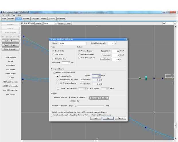 A continuación, seleccionar el segmento y cambiar a un segmento de freno. Configuración de tipo, puede cambiar varias propiedades del segmento de freno. Puesto que el segmento es perfectamente plano, un dispositivo de transporte es necesario para mover el tren fuera del bloque. Marque la casilla de verificación "Habilitar dispositivo de transporte" para crear un transporte del freno ejecutar. Puede modificar los ajustes tales como la velocidad y tipo de los dispositivos de transporte.
