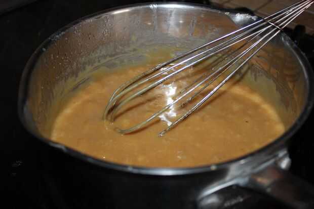 Una vez que la mantequilla se haya derretido, añadir el azúcar de 1 1/2 C, 1/2 taza de leche, 1 t vainilla y mantequilla de maní de 1/2 C, batir hasta que se mezcle.