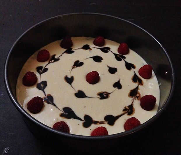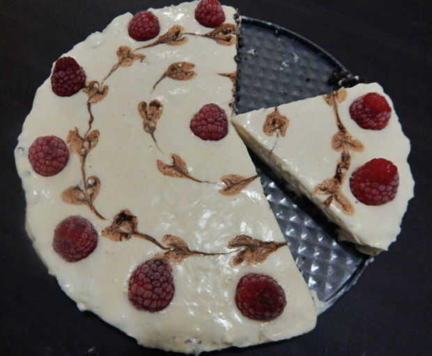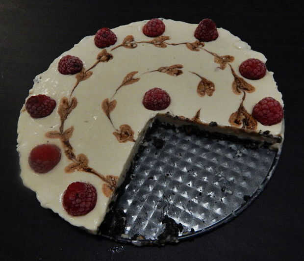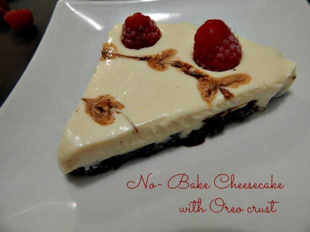 La corteza de la base es hecha de migas de oreo, el relleno es la mezcla de queso crema y condensar la leche. Rematado con salsa de chocolate y frambuesas frescas. Suena delicioso verdad??