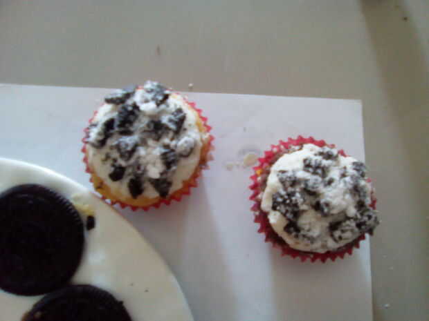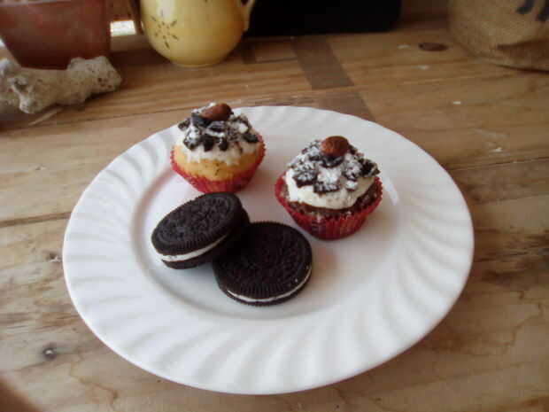 Decorar con Oreo aproximadamente crunch, poner almendras en la parte superior y espolvoree azúcar glas, coloque Oreo en placa.