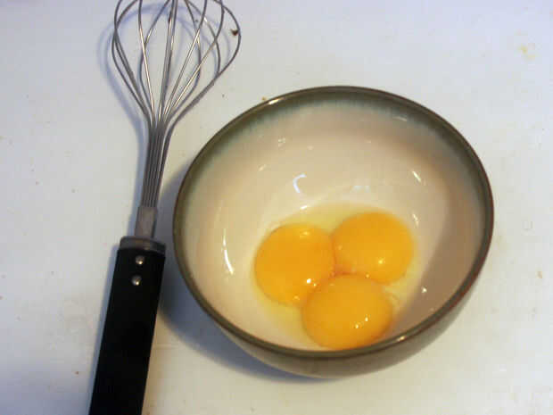 Batir las yemas y el restante 1/3 taza de azúcar en un tazón mediano hasta que espese ligeramente. Vierta lentamente la crema caliente en la mezcla de yema de huevo, batiendo constantemente.