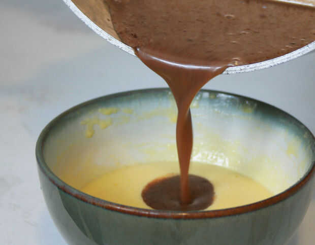 Vierta inmediatamente flan sobre la mezcla de gelatina y revuelva hasta que esté suave y la gelatina se haya disuelto completamente.