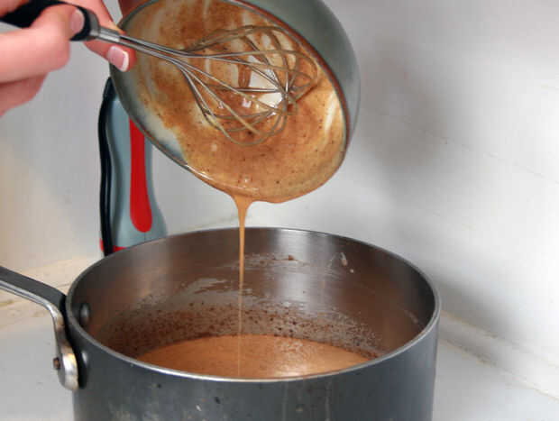 Volver la mezcla a la cacerola y cocinar a fuego medio-bajo, revolviendo constantemente y raspando el fondo de olla con una espátula de silicona, hasta que la crema se espesa y registra 175 a 180F (80-82C) en un termómetro de lectura instantánea (unos 2 minutos).