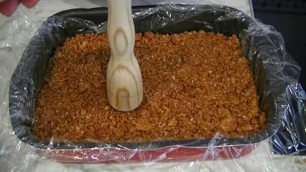 Vierta la mezcla de galletas en una bandeja forrada con papel o film transparente, para hacerlo más fácil quitar más adelante y paquete de fondo de pozo.