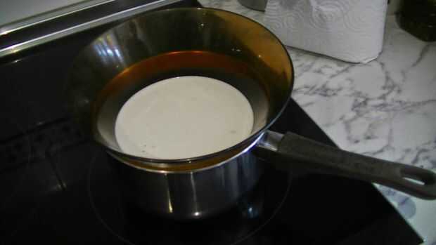 Sobre una cacerola de agua caliente Coloque un recipiente de vidrio con la crema en ella asegurándose de que el bol no toque el agua en la cacerola a calentar la crema.