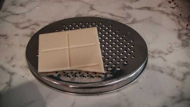 Un opcional es rallar el chocolate sobre el pastel terminado. Aquí estoy utilizando chocolate blanco contraste pero pueden utilizar cualquier chocolate que tienes.