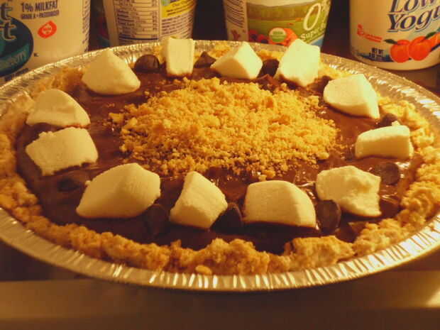 tuve cierta izquierda sobre aplastado galletas que coloqué en el centro de la tarta y luego alrededor del borde le puse malvaviscos cortados para arriba y chips de chocolate.