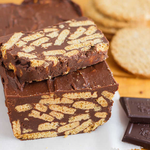 Derrita el chocolate en una olla de agua hirviendo. Agregue la mantequilla derretida y mezclar hasta que quede suave. Retire del fuego. Mezclar la leche condensada y dejamos que se enfríe un poco. Romper las galletas y los echan en un recipiente grande.